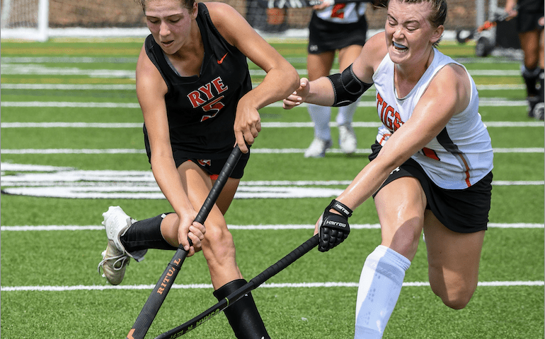 The Tigers generated several scoring chances—peppering Rye goalie Chloe Holden with 23 shots on the day—but couldn’t break through until late in the first half when Kate Orchanian converted on a penalty corner chance.